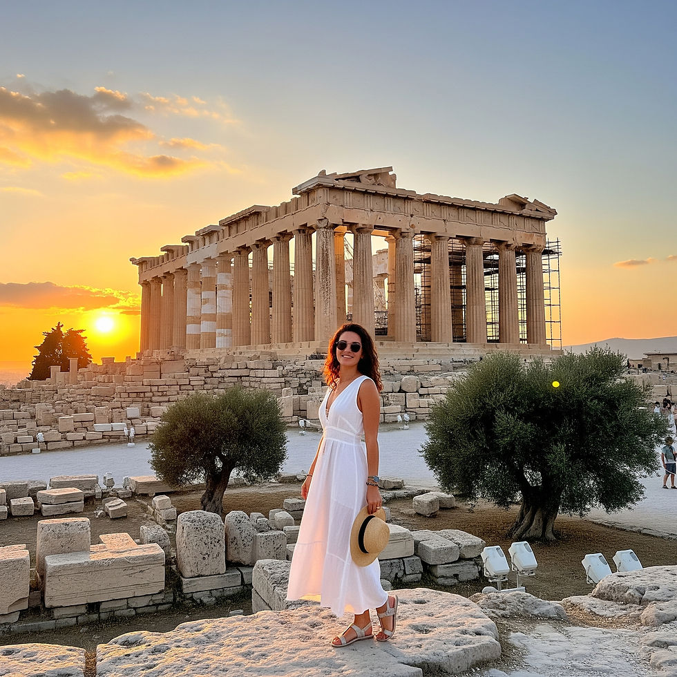 Grecia es un sueño bañado por el sol del Egeo, pero la joya indiscutible de sus islas es la espectacular Santorini, un lugar cuya belleza te dejará sin aliento. Imagina un paisaje de acantilados volcánicos sobre los que caen en cascada sus icónicas casas blancas, salpicadas por el azul intenso de las cúpulas de sus iglesias. Desde cada rincón, tendrás vistas infinitas al mar de un azul profundo que llena la caldera. El momento cumbre llega al final del día, cuando te unirás al ritual mágico de contemplar una de las puestas de sol más famosas del mundo, un espectáculo de colores que tiñen el cielo mientras el sol se sumerge lentamente en el horizonte, creando un recuerdo imborrable.